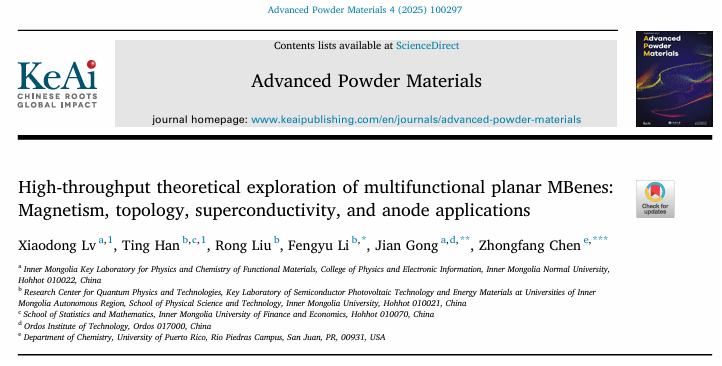 近日,我院吕晓东副研究员、宫箭教授 (yl23455永利兼职教授,博士生导师) 与内蒙古大学李锋钰教授、美国波多黎各大学陈中方教授合作在理论设计新型功能二维材料领域取得新进展,相关成果以“High-throughput theoretical exploration of multifunctional planar MBenes: Magnetism, topology, superconductivity, and anode applications”为标题发表在国际材料科学期刊《Advanced Power Materials》上(中科院1区top期刊,IF = 24.9)。吕晓东副研究员为第一作者,李锋钰教授、宫箭教授、陈中方教授为论文共同通讯作者,yl23455永利为第一完成单位。(论文链接:https://www.sciencedirect.com/science/article/pii/S2772834X25000338)。