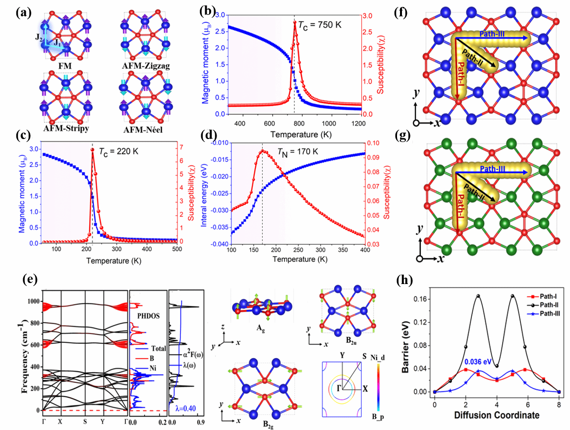 图2(a)MBene体系的磁结构;(b-d)Fe/Cr/CoB的铁磁(FM)态下,磁矩(蓝色)和磁化率(红色)随温度的变化示意图;(e)NiB单层的声子谱图;声子态密度(PHDOS);Eliashberg谱函数α²F(ω)及电子-声子耦合常数λ(ω;