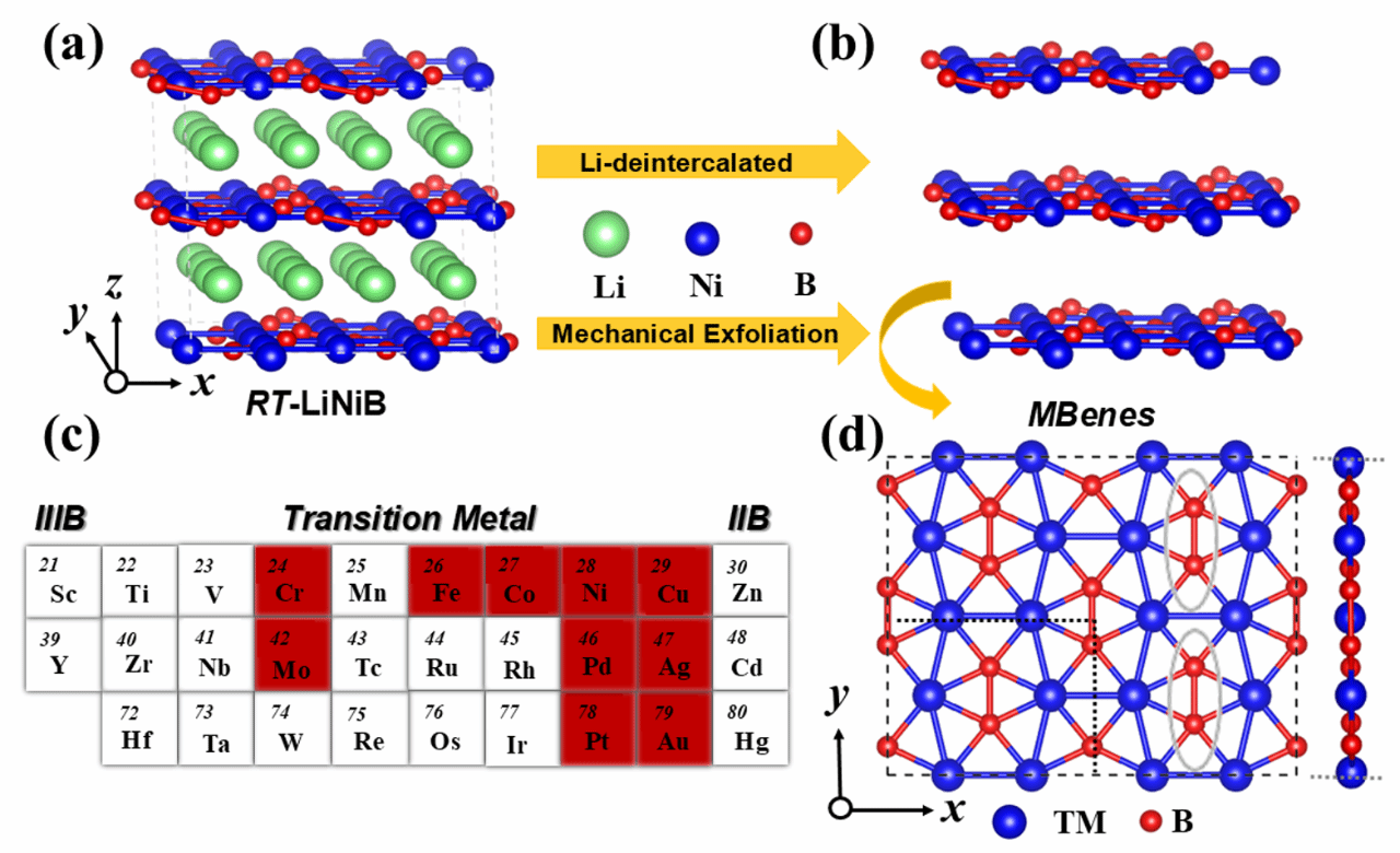 图1(a)室温下层状LiNiB相的晶体结构;(b)通过机械剥离获得的稳定NiB层。(c)本研究中考虑形成过渡金属(M)硼化物(MBene)单层材料过渡金属。(d)MBenes的俯视图和侧视图。