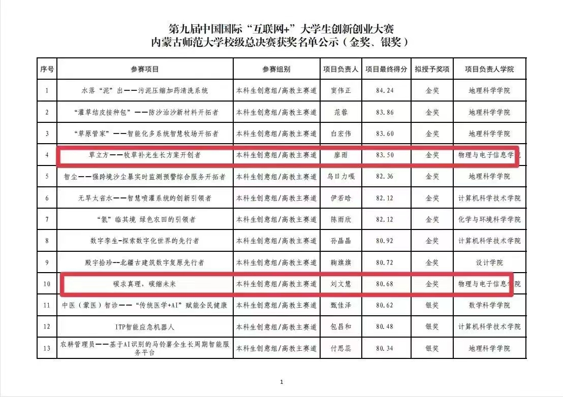 7月4日,第九届“互联网+”大学生创新创业大赛校赛决赛结束,我院摘得了三金四银的好成绩,其中“草立方——牧草补光生长方案开拓者”、“碳求真理,碳缩未来”、“'毕力'铜锌践行'碳中和'——新型无机薄膜太阳能电池的应用”获得高教主赛道本科生、研究生创意组金奖,“防'冻'未然——冻土成分检测先行者”、“碳立方——葵花籽壳衍生钠离子电池硬碳负极材料”获得高教主赛道本科生创意组银奖,“'红石榴'科技下乡——坚持21年的助力农业农村现代化公益服务”、“星火燎原——科普教育助力乡村振兴”取得了青年红色筑梦之旅公益组银奖。