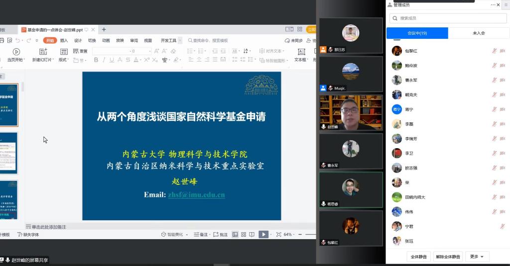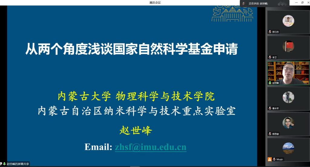 为做好2023年度国家自然科学基金项目申报工作,进一步提升申报质量,1月8日下午, 我院召开国自然申报动员会,特邀内蒙古大学物理科学与技术学院赵世峰教授作“从两个角度浅谈国家自然科学基金申请”专题讲座。副院长那日苏主持会议,院长曹永军和相关教师参会。