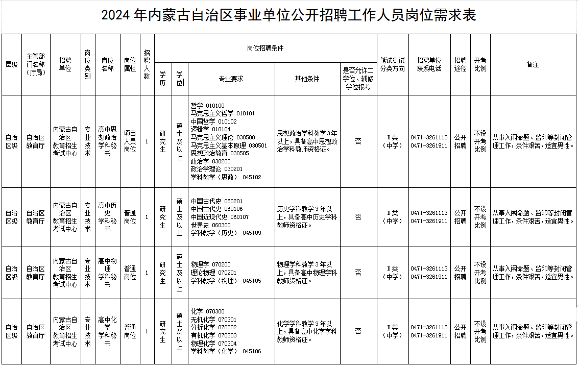 经内蒙古自治区人社厅和教育厅批准,内蒙古自治区教育招生考试中心通过2024年内蒙古自治区事业单位公开招聘方式,招录4名学科秘书,分别是高中思想政治学科秘书、高中历史学科秘书、高中物理学科秘书、高中化学学科秘书。