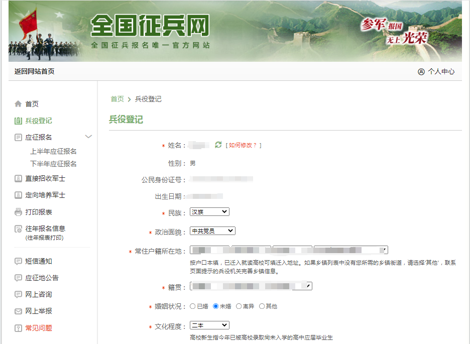 登录成功后进行兵役登记,填写相关个人信息,完成登记点击继续进行本年度参军报名。