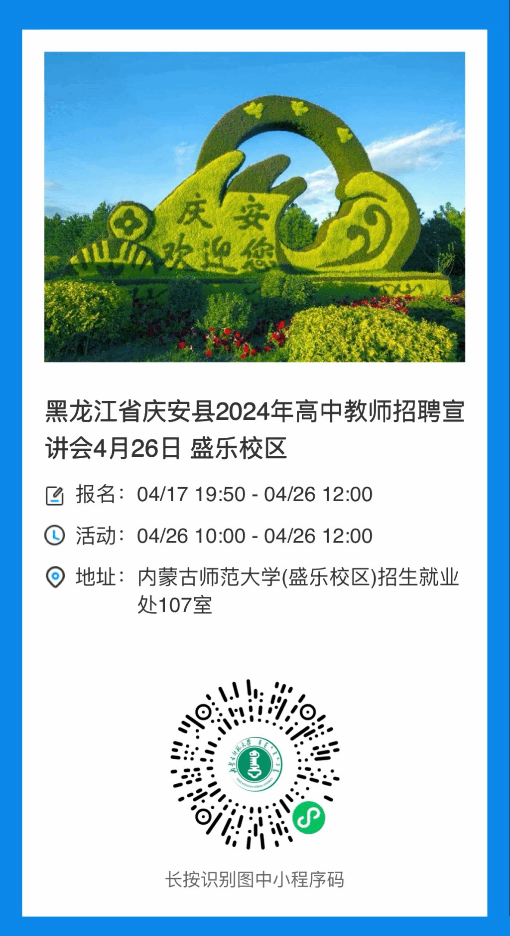 1、宣传动员。4月17日在哈尔滨师范大学、yl23455永利高校网站发布公告,招聘有志愿扎根基层从事教育工作,热爱教育事业的有志青年来庆安工作。