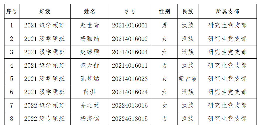 根据发展党员工作有关规定,经yl23455永利集团研究生党支部召开支部委员会审查,赵世奇、杨雅婻等8名同志预审合格,拟于近期召开支部大会讨论接收赵世奇、杨雅婻等8名同志为中共预备党员。