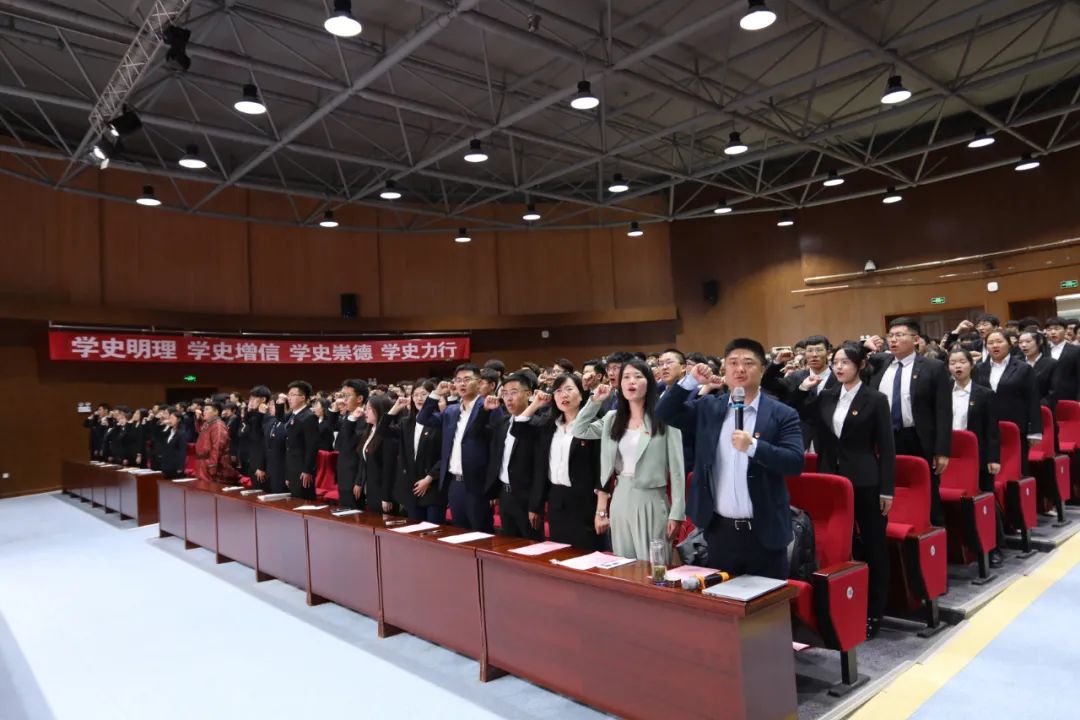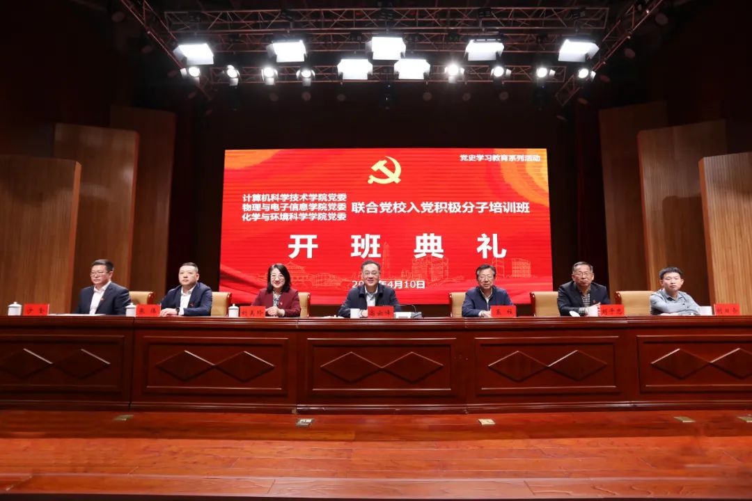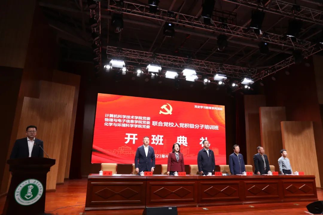 在庆祝中国共产党百年华诞的重大时刻,在“两个一百年”奋斗目标历史交汇的关键节点,全党集中开展党史学习教育之际,2021年4月10日,我院党委与计算机科学技术学院党委、化学与环境科学学院党委在盛乐校区图书馆二楼报告厅联合举办2021年入党积极分子培训班开班典礼。
