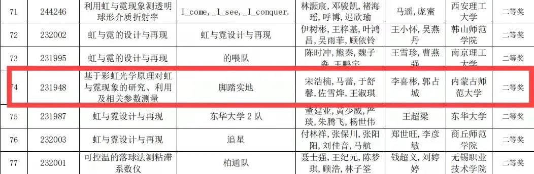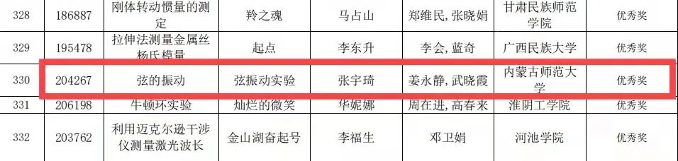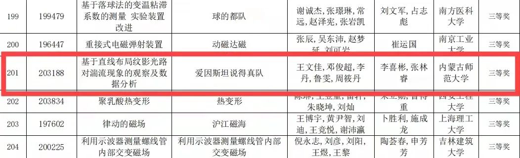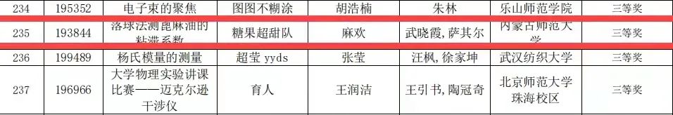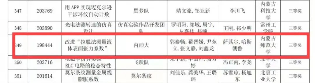 《改进拉脱法测量液体表面表面张力系数》(自选课题类三等奖),团队由2019级物理学汉一班翟晋媛、2019级材料物理班尹东立、2019级电子信息工程二班郭泰畅、张文静、刘鑫龙组成,指导教师萨其尔、哈斯朝鲁。