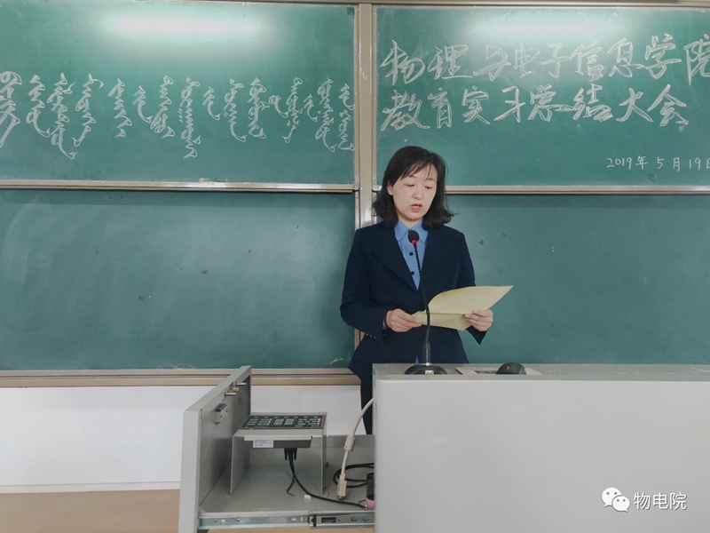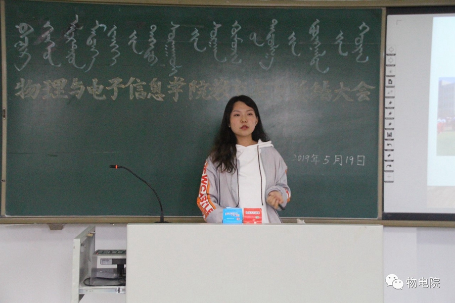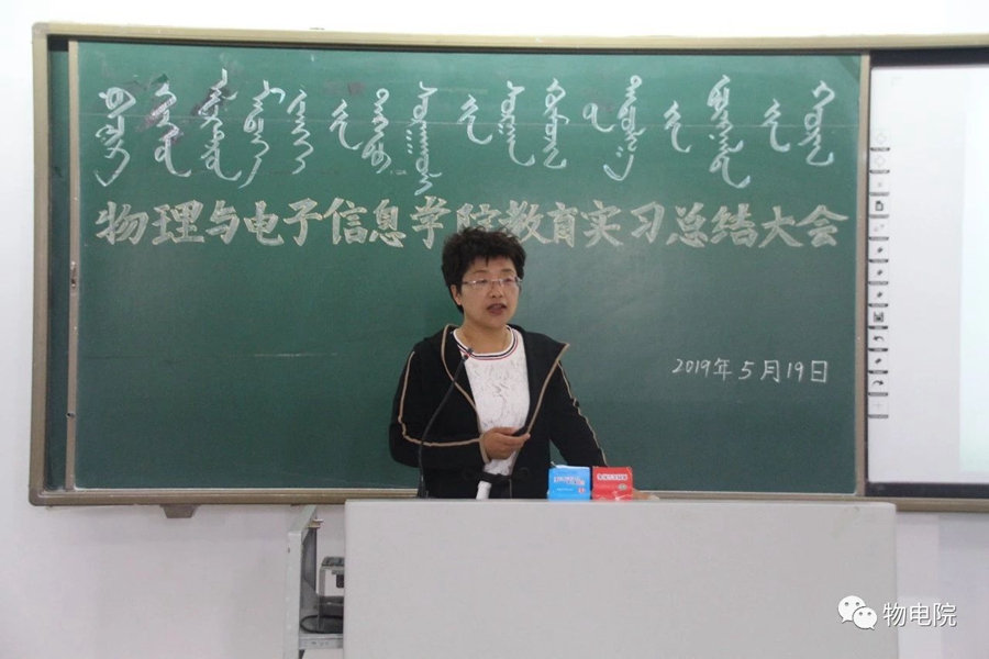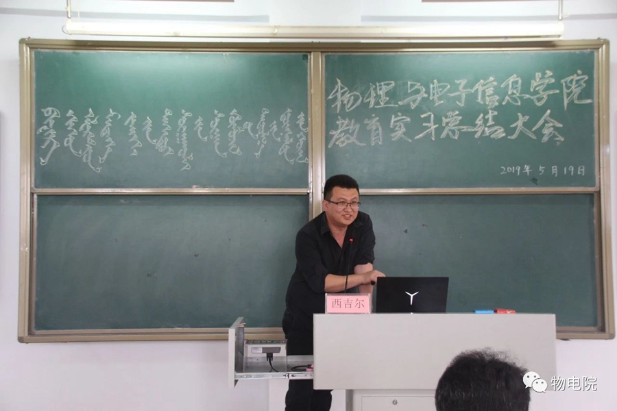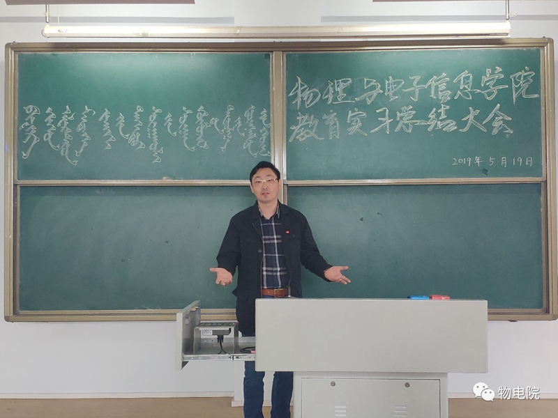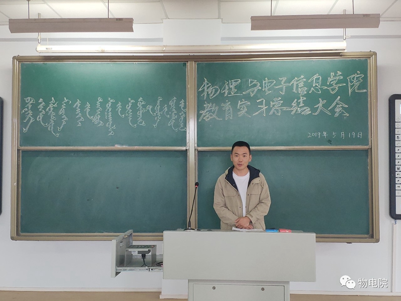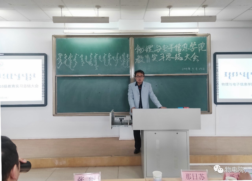 为让17、18级师范生对教育实习有更加全面深刻的认识,对教师这一职业提高认同感与自豪感,同时对16级物理专业的教育实习做总结,5月19日上午,我院在盛乐校区行知楼225教室,举行yl23455永利集团教育实习总结大会。学院党总支副书记兼副院长张伟、副院长那日苏、物理系副主任朝克夫、实践创新部副主任万欣欣、2016级物理学汉班班主任孙咏萍、18级物理汉班班主任其木格、2017级物理蒙班班主任木其尔,以及呼市蒙古族中学老师西吉尔老师参加会议,会议由万欣欣主持,学院16、17、18级物理学专业全体学生参加大会。 首先,那日苏老师对2016级教育实习基本情况做了汇报,并对“六卓越”、“一拔尖2.0”结合实际和师范专业认证层面为同学们进行了详细的介绍和阐述。随后,西吉尔老师为大家介绍了初步探究中小学物理科技实验室的建设与运行方案。他从物理科技实验室简介,初探实验室建设思路,初探物理实验室的运行方法,未来我们能做什么四个方面来展开讲述,使同学们对人工智能、国内顶尖中学实验室配置情况等有了更详尽的了解,也让大家对未来科技走向有了新的认识、对自身发展有了更明确的目标。最后,16级蒙汉实习生代表为大家分享了自己和小组的见习心得与体会,他们精彩的演说赢得了阵阵掌声,学弟学妹们对教师这个职业有了深深的期待,并为自己是一名师范生而自豪。 本次大会,对刚刚结束的教育实习做了全面细致的总结,提高了16级物理专业学生的职业认同感和对待工作的责任感。同时让17、18级学生提前对教育实习有了了解,以便做好充足准备,迎接新的挑战和机遇。