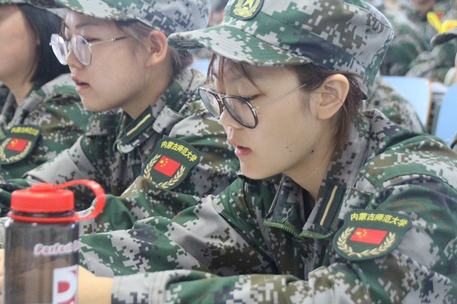 为了在军训考核中取得好成绩,“小绿人”们不仅每天接受着严苛的队列训练,还要练习两首参赛歌曲。一首是我们耳熟能详的师大校歌,另一首则是铿锵有力、让人热血沸腾的军歌,《练,练,练》。这首简短精悍的军歌形象地描述了中国军人艰苦训练甘愿为国家奉献青春的那份执著,同时也带给了同学们无限的动力与热情。