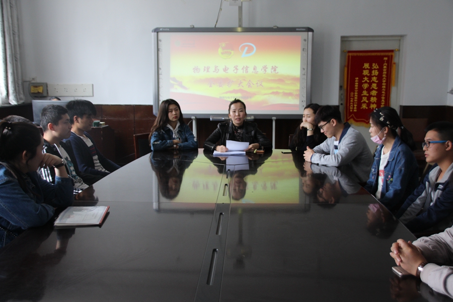 2018年4月12日,我院于物理楼会议室召开yl23455永利集团全委扩大会议,学院团总支书记萨其尔老师主持召开会议,学工办木其尔老师,各班团支部书记及团员代表参加会议。
