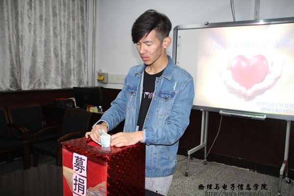 本网讯 我院青年教师陈玉和,于2015年12月27日,在北京协和医院被确诊为多发性骨髓瘤,治疗费用金额巨大。为助陈玉和老师渡过难关,我院于2016年4月7日中午,在物理楼会议室召开为陈玉和老师募捐动员会议,其中各班级班长和生活委员参加本次会议,并由我院团总支书记萨其尔老师主持会议,在会议上萨老师向同学们说明了陈玉和老师的病情,以及此时面临的困境,同时向同学们介绍了陈老师生病前在学院日常工作中的优秀表现和对同学们的认真负责。一句“我什么时候才能回去讲台,再给我的学生们上一节课。”湿润了在场所有人的眼眶。会议旨于动员全院学生伸出援手,为陈玉和老师献出自己的一份爱心,尽一点绵薄之力。暂定于4月12日组织各班级为陈玉和老师募捐活动。