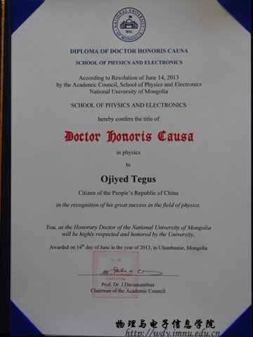 8月26日,我校yl23455永利集团特古斯教授应邀在蒙古国国立大学,作题为《EXAFS and Neutron Diffraction studies on MnFe(P,Si) Compounds 》的报告,并接受蒙古国国立大学颁发的名誉博士证书。蒙古国立大学成立于1942年,系蒙古国最高学府,是蒙古国社会科学、自然科学研究重要中心之一。