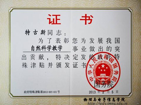 根据国家人力资源和社会保障部《关于公布2012年享受政府特殊津贴人员名单的通知》(人社部函[2013]31号),2012年自治区共有45名专家、学者、技术人员获准享受国务院政府特殊津贴,其中我院院长特古斯教授获此殊荣。