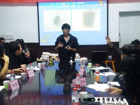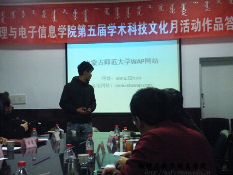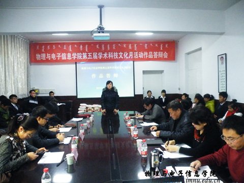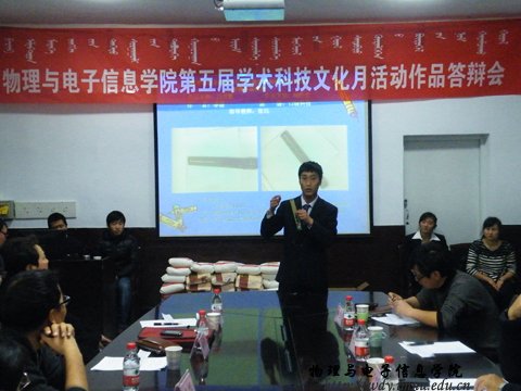 为展示我院学科专业的学术科技创新实力,带动和启发创新意识,营造科技创新的氛围,提高广大学生对科技发明和创新的认识。在学院的高度重视下,我院继承往年优良传统,于2012年12月8日下午两点在物理楼会议室成功举办了“第五届学术科技文化月活动”作品答辩会。本次答辩会出席的老师有:副院长吉日嘎拉老师,副院长刘美玲老师,党总支副书记何小龙老师,梁学军老师,海鹰老师,张丽娜老师,朝克夫老师,孟巴根老师,杨帆老师,侯爱玲老师,呼和老师。