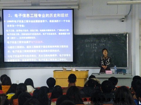 为进一步加强我院电子信息专业的学生对自己专业的了解与认识,我院在2012年11月20日上午10点在田家炳教学楼八共教室举行电子信息工程专业指导讲座。由实践创新部副主任张丽娜老师主讲。出席此次讲座的有:学工办呼和老师和所有12级电子信息工程专业的学生。