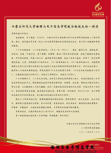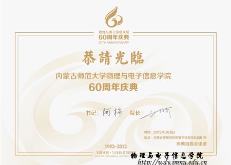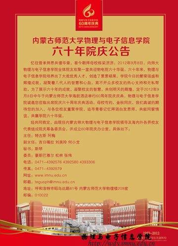 六十载耕耘不辍,六十年春华秋实。2012年,yl23455永利将迎来六十华诞,yl23455永利集团(原物理系)也将迎来六十周年院庆。六十年来,yl23455永利集团培养出了大批优秀人才,创造了累累硕果。学院今日的繁荣强盛和辉煌成就,凝聚着几代人的智慧和心血,离不开社会各界和众多校友的热心支持和无私帮助,为了展示六十年的成就,凝聚校友的智慧,共创明天的辉煌,yl23455永利集团定于2012年9月8日中午于yl23455永利海航酒店举行60周年院庆庆典,学院全体师生诚邀您莅临出席院庆六十周年庆典。母校有约,金秋同庆,我们真诚的期待您的加入,与各位校友重聚学院,追寻青春记忆拜谒白发恩师,共叙同窗情谊,共襄学院六十华诞。