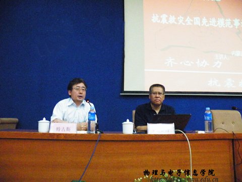2012年7月2日上午9:30,我院在信息楼报告厅举行了“迎母校六十周年校庆”系列讲座,此次讲座邀请到我院89级物理学汉授班校友,现就职于内蒙古自治区地震局卓力格图副局长,一位曾经奋战在汶川抗震救灾工作第一线的抗震英雄。会场上座无虚席,yl23455永利集团党总支书记阿梅老师、院长特古斯教授、副院长吉日嘎拉老师、副院长刘美玲老师、党总支副书记何小龙老师以及学院的全体教职工、研究生、本科生共计200余人聆听了此次讲座。