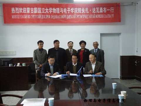 根据2011年9月6日杨一江校长与蒙古国国立大学校长特木尔敖其日代表两校签署的合作协议,10月13日蒙古国国立大学物理与电子学院院长来我院在科学研究、学术交流、人才培养等方面的合作进行了协商。