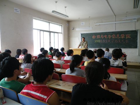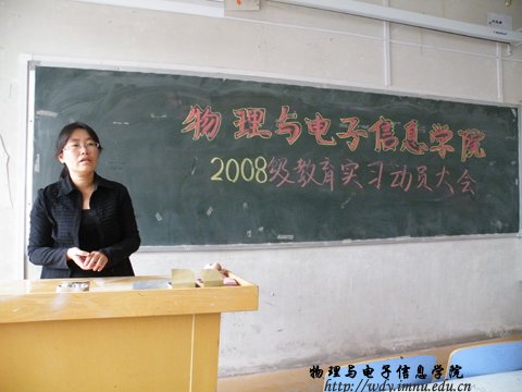 8月31日15:00我院在田楼223召开了08级物理系教育实习动员大会,参加动员大会的老师有副院长吉日嘎拉老师、物理系孙咏萍老师、那日苏老师。会议由物理系主任张敏老师主持。