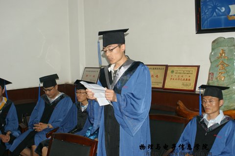 典礼上研究生代表耿遥祥同学代表我院全体硕士毕业生发言。他说,研究生们能够有丰硕的研究成果,是得益于良师的指导和丰富的学习资源。无论是继续深造还是步入社会,他们都会牢记母校的校训,用知识回报社会,用成就回馈母校和学院,以报答他们的恩师。