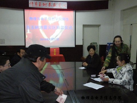 震灾无情,人间有爱。自玉树地区发生7.1级地震后,全国各族人民纷纷行动起来,以各种方式支援灾区。4月27日下午,我院师生汇集在物理楼会议室,向玉树灾区人民捐款。