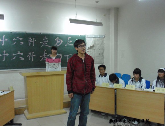10月16日晚7:30,在田楼126进行了第二场比赛,正方为09工程2班,题目为三十六计走为上,反方为09物理汉班,题目为三十六计走为下。比赛当中各位辩手积极发言,气氛高涨。赛后,同学们表演了优美的节目,把辩论赛推向高潮。最后,09物理汉班获胜。明天将进行09工程3班和09科技班的比赛,敬请关注。