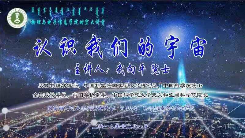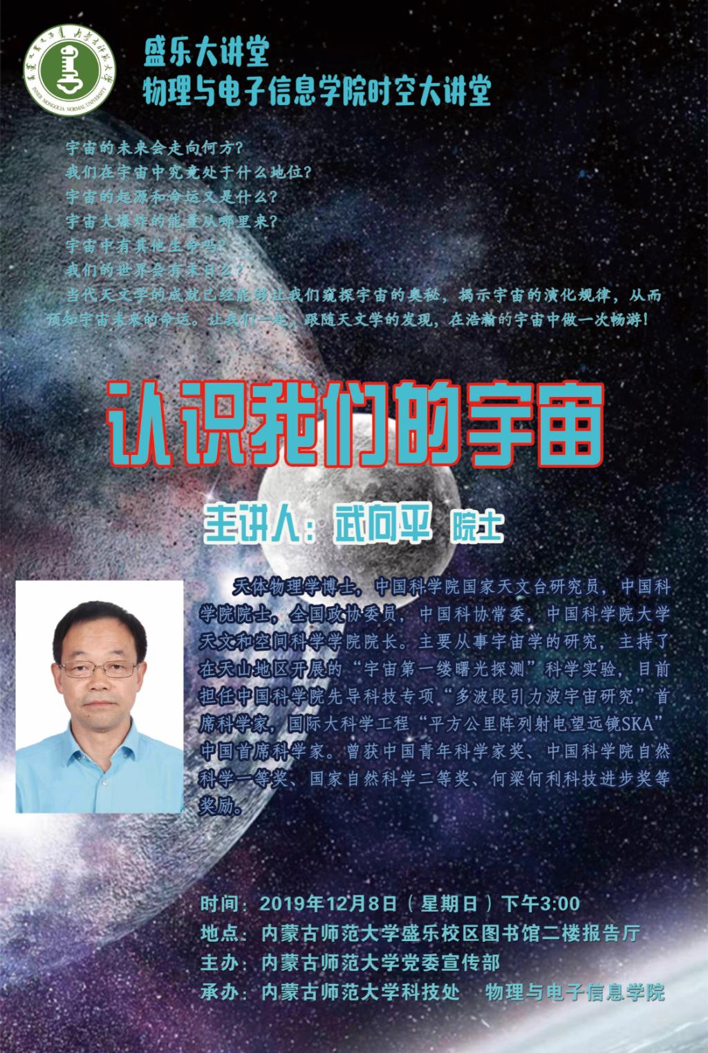 武向平,天体物理学博士,中国科学院国家天文台研究员,中国科学院院士,全国政协委员,中国科协常委,中国科学院大学天文和空间科学学院院长。主要从事宇宙学的研究,主持了在天山地区开展的“宇宙第一缕曙光探测”科学实验,目前担任中国科学院先导科技专项 “多波段引力波宇宙研究”首席科学家,国际大科学工程“平方公里阵列射电望远镜SKA”中国首席科学家。曾获中国青年科学家奖、中国科学院自然科学一等奖、国家自然科学二等奖、何梁何利科技进步奖等奖励。