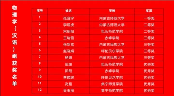 近日,由内蒙古自治区教师教育协同创新联盟和内蒙古自治区教育协会主办、包头师范学院承办的内蒙古自治区师范生教学技能大赛圆满落幕,本次比赛吸引了来自包头师范学院、内蒙古民族大学、集宁师范学院、呼伦贝尔学院、赤峰学院、呼和浩特民族学院、河套学院和我校八所院校的90名指导老师和174名选手参赛。其中,我院张晓宇、李萌虎分别获得物理学(汉语)授课的一等奖与二等奖。