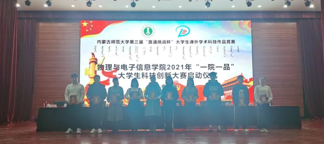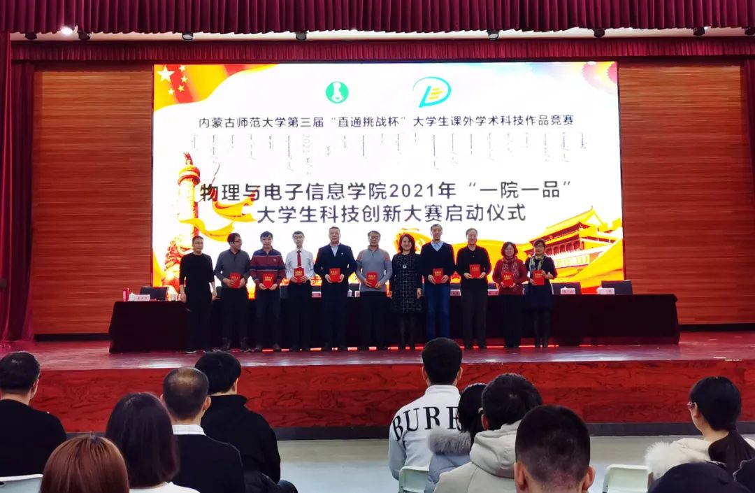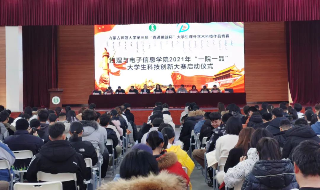 为引导和激励我院学生崇尚科学、追求真知、勤奋学习、锐意创新的精神,提高同学们的创新素质和实践能力,12月25日下午,我院在盛乐校区学生事务中心二楼多功能演播厅举办2021年“一院一品”大学生科技创新大赛启动仪式。本次活动由校团委主办,yl23455永利集团团总支承办。学院党委书记刘美玲、副书记兼副院长曹永军、副书记兼副院长张伟、副院长那日苏、赵凤岐教授、材料系主任田晓、实践创新部主任梁学军、物理系副主任朝克夫、孙咏萍副教授、电子系信息处理教研室主任杨帆、19级汉二班班主任李喜彬等学院领导老师出席,20级全体研究生及本科生参加启动仪式。我院团总支负责人宝力尔主持会议。
