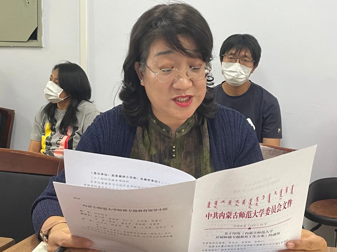会议第二项,由我院党委书记刘美玲领学师德师风建设学习。刘书记从目标任务、总体要求、教育内容、工作安排及工作要求等方面传达《yl23455永利开展师德专题教育工作方案》,之后对《yl23455永利教师师德师风建设学习手册(第一版)》、《师德警示教育(一)——违反高校教师职业行为十项准则典型案例》进行领读学习。