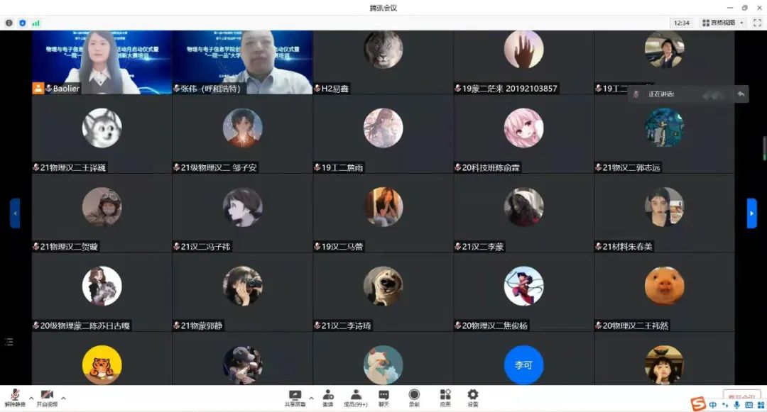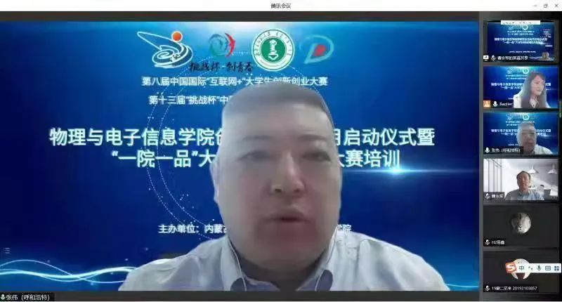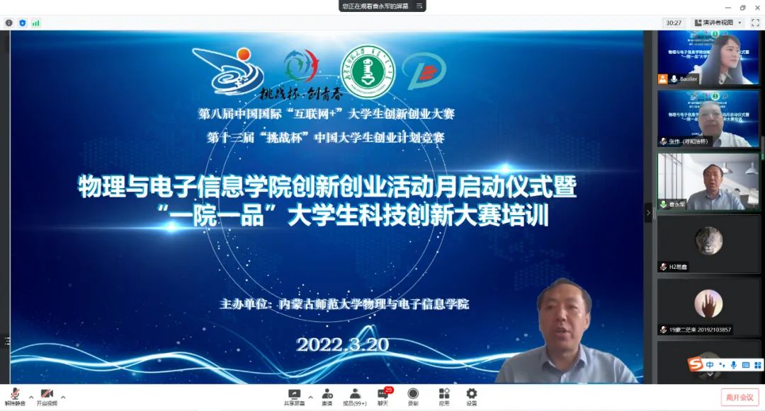 2022年政府工作报告提到:深入实施创新驱动发展战略,巩固壮大实体经济根基。推进科技创新,促进产业优化升级,突破供给约束堵点,依靠创新提高发展质量。扎实做好高校毕业生等重点群体就业工作,推进大众创业万众创新。为积极响应国家号召,引导和激励我院学生崇尚科学、追求真知、勤奋学习、锐意创新的精神,提高同学们的创新素质和实践能力,选拔优秀作品参加第八届中国国际“互联网+”大学生创新创业大赛、第十三届“挑战杯”中国大学生创业计划竞赛以及其他学术科技竞赛奠定良好基础,3月20日上午,我院师生相聚云端,线上举办yl23455永利集团2022年创新创业活动月启动仪式暨“一院一品”大学生科技创新大赛培训。学院党委书记刘美玲、院长曹永军、副书记兼副院长张伟、副院长那日苏、、物理系主任朝克夫、副主任孙咏萍、王彦、电子系主任梁学军、副主任包秀荣、张珏、材料系主任包黎红、副主任塔娜、实践创新部副主任杨帆、综合办主任兼大学物理教学部主任张天臣、学就办副主任王乐等领导老师出席,学院各年级学生共300余人参加启动仪式。启动仪式由我院团总支副书记宝力尔主持。