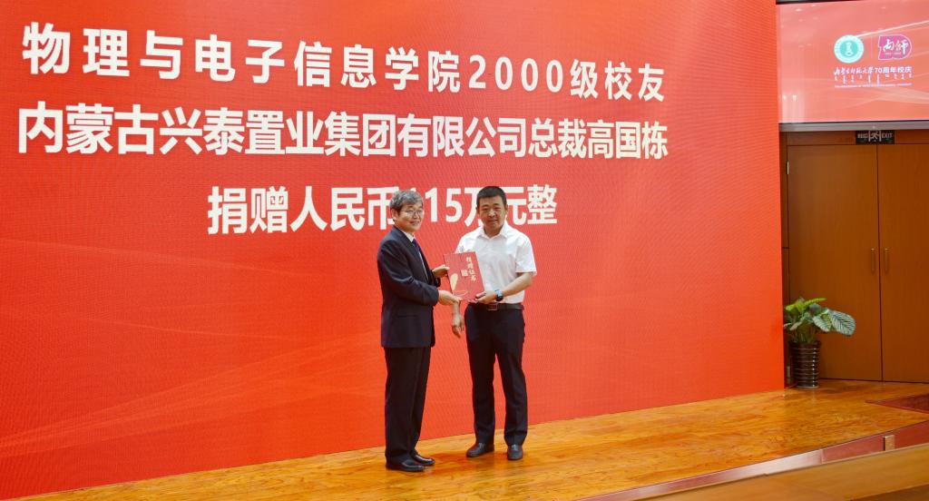 我院2000级校友、青年企业家、内蒙古兴泰置业集团有限公司总裁高国栋先生,怀着浓情捐资115万元人民币,这既是对母校70华诞的美好祝福,更是对学校、学院发展建设的有力支持。学校的发展和进步离不开校友的关爱和帮助,诚挚欢迎广大校友关心支持母校发展建设,积极为母校发展献策出力,为母校的兴盛做出新贡献。yl23455永利集团党委书记刘美玲表示,院友情系母校,关心母校,支持母校发展,令人感动,衷心感谢!母校永远是校友们温暖的家,是校友们坚强的后盾,欢迎常回家看看。