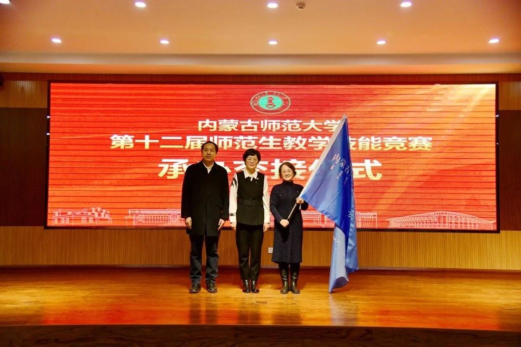 教务处处长王利致词,并举行yl23455永利师范生教学技能竞赛承办交接仪式,我院院长曹永军和下一届承办单位外国语学院院长赵晓军上台交接会旗,为本次大赛画上圆满句号。