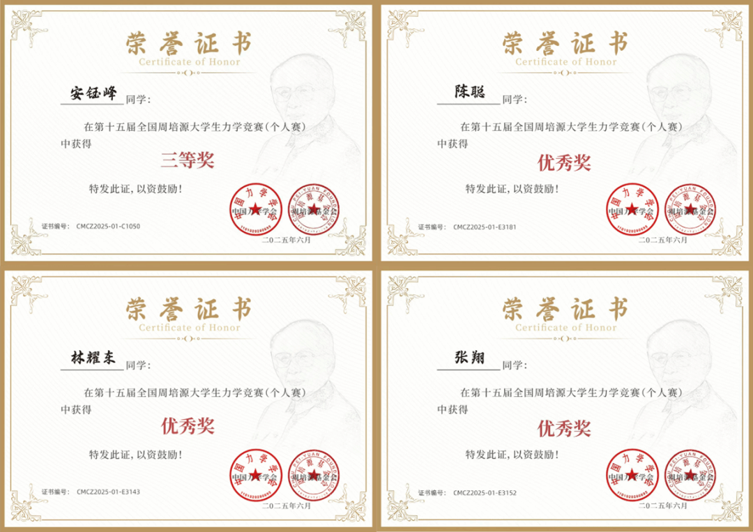 在2025年5月18日举办的第十五届全国周培源大学生力学竞赛中,我院学生发挥出色,获得多项奖项。其中,安钰峰获得国家三等奖,陈聪,林耀东,张翔获得国家优秀奖。