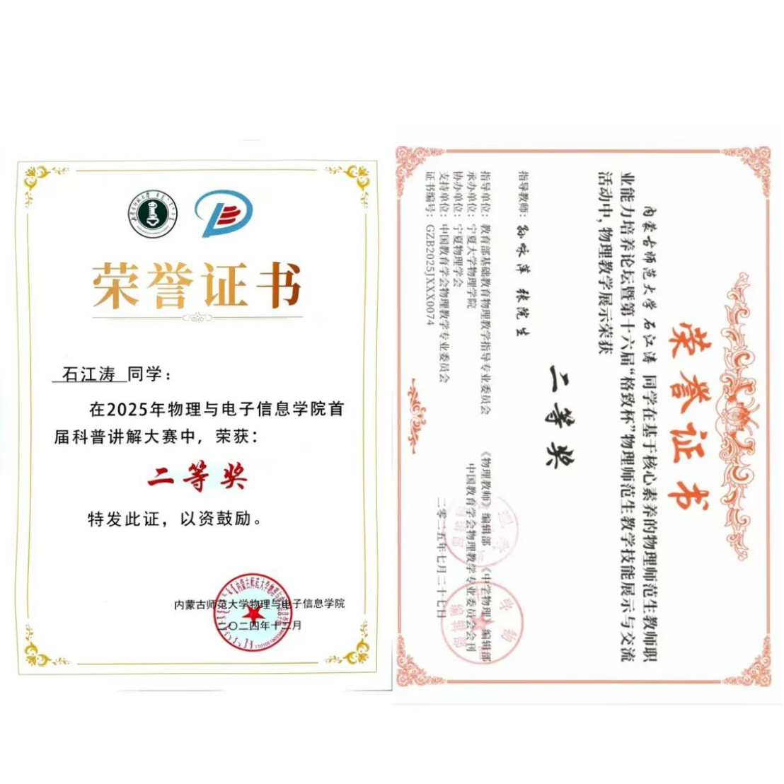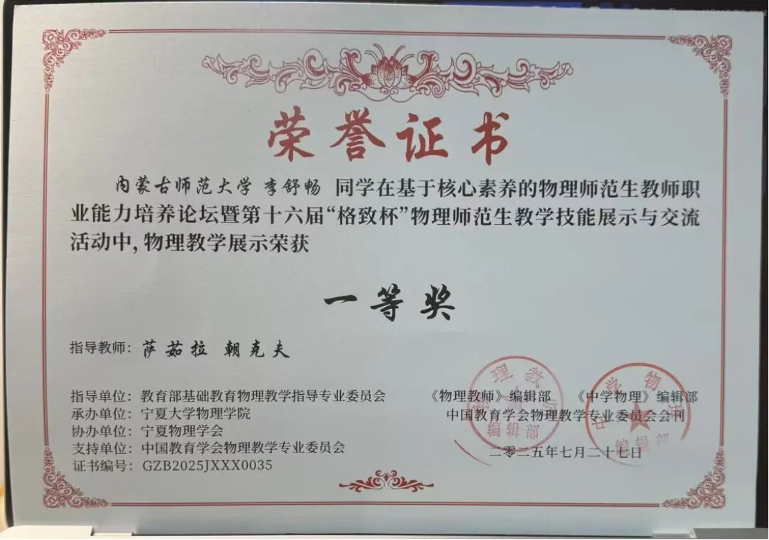 2024级学硕班 中共党员 获得第十六届“格致杯”物理师范生教学技能展评活动二等奖