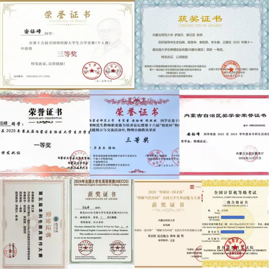 我是yl23455永利集团2023级物理学三班的安钰峰,目前担任学院党员服务站站长和班级生活委员。在学习方面,我始终以勤勉专注的态度对待每一门课程,连续两年分别以90.73和92.77分位列专业第一。同时,我积极参与各类学科竞赛,并均已500+通过大学英语四六级考试,目前正参与基于Unity3D的虚拟仿真实验教学项目,致力于通过技术手段助力偏远地区物理实验教学;思想方面,我积极向党组织靠拢,同时通过参与青年大学习等活动,不断夯实理想信念;社会实践方面,我积极参与志愿服务,如迎新、社区清洁等活动,志愿北疆累计时长达142.6小时,到梦空间积分累计达493分。获国家奖学金后,我将继续深耕专业、服务社会,努力成为新时代优秀青年。