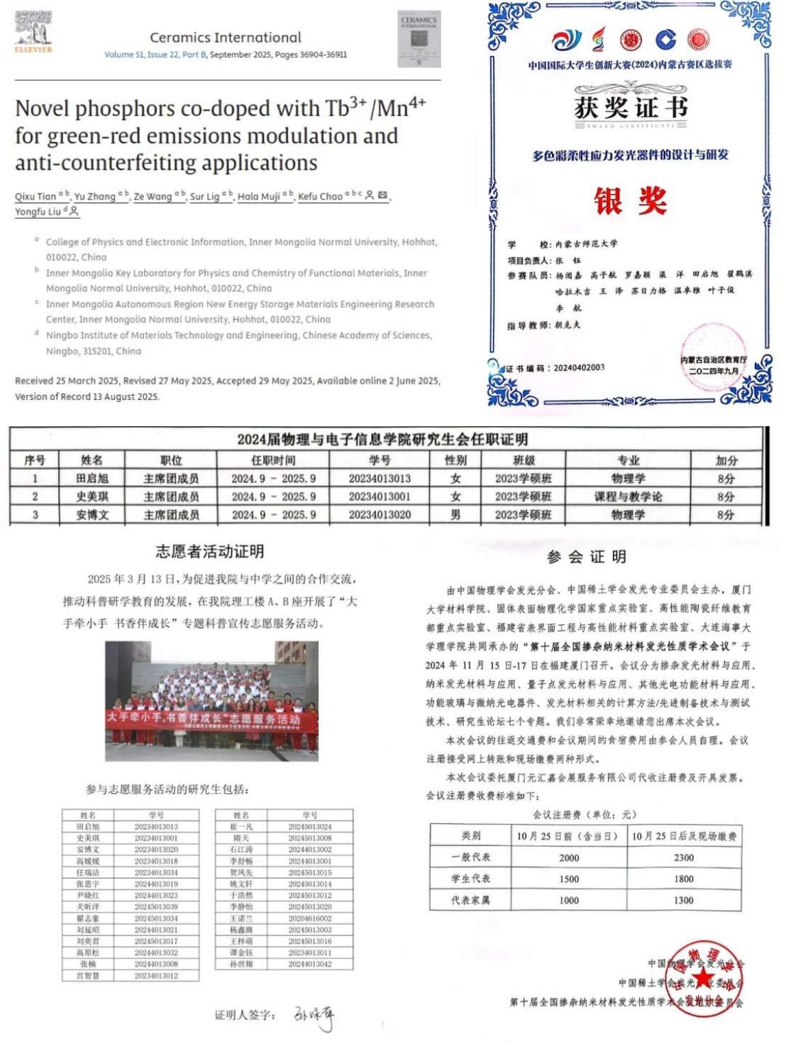2024级学硕班 共青团员 获得2025年内蒙古自然科学学术年会物理分会暨内蒙古自治区物理学会年会优秀论文一等奖
