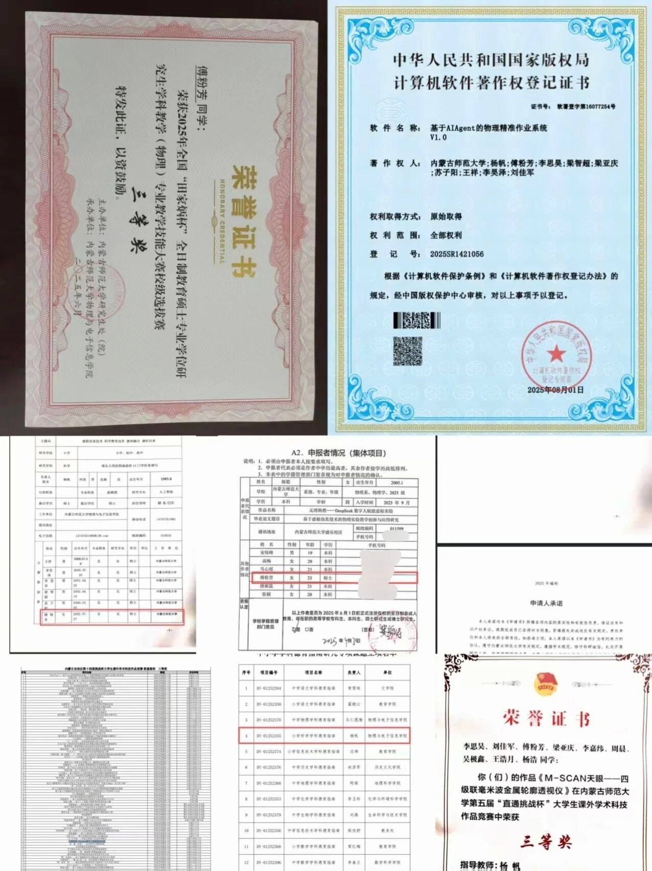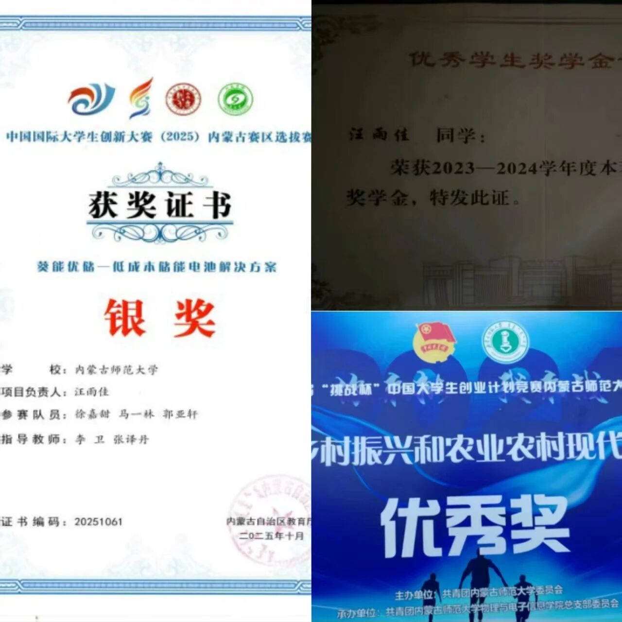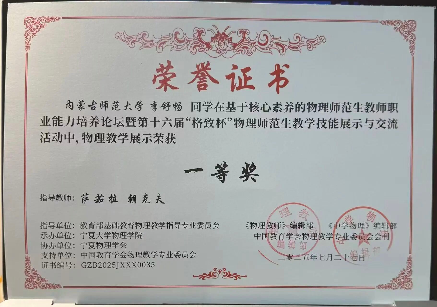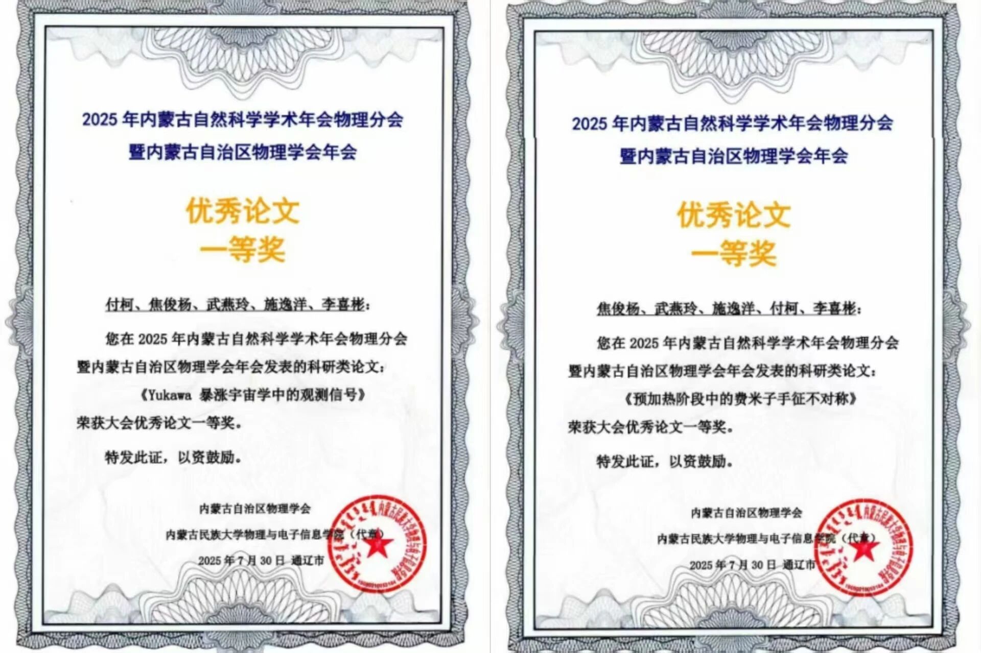 2024级学硕班 共青团员 获得2025年内蒙古自然科学学术年会物理分会暨内蒙古自治区物理学会年会优秀论文一等奖