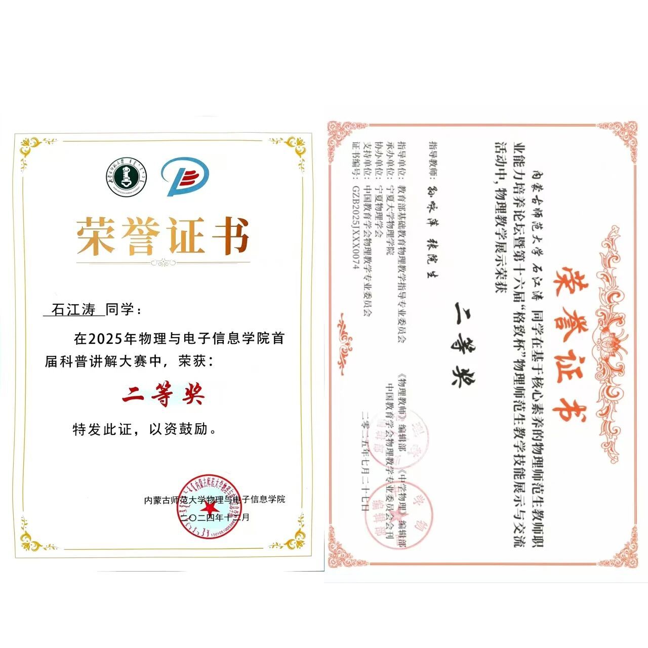 2024级学硕班 中共党员 获得第十六届“格致杯”物理师范生教学技能展评活动二等奖