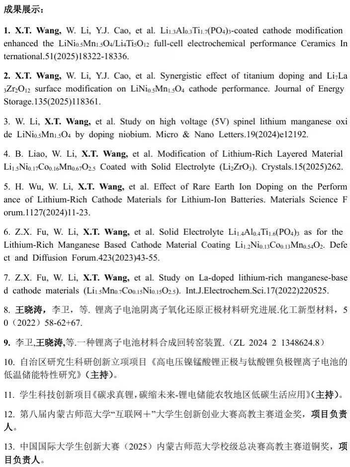 研究生阶段的学习与科研是我人生中宝贵的经历。在实验室里,我不仅亲手操作、反复调试各种实验仪器,更在一次次失败与成功中,深刻领悟到科研的真谛:它不仅仅是得到漂亮的数据,更是学会如何设计实验、分析问题,并独立掌握一套从表征到性能测试的完整研究方法。这份能力的养成,离不开导师高屋建瓴的指引,也离不开组内外师兄师姐们毫无保留的经验分享。这份在科研中磨练出的韧性,也延伸到了我的学习与生活中。这段经历,与我从学生科技创新项目到数学建模竞赛的实践相互印证,让我最终收获了两篇SCI论文的成果。回望来路,我收获的远不止奖项与论文,更是一颗面对未知敢于探索的恒心,一套解决问题的科学方法,以及一个由良师益友构成的、能支撑我走得更远的科研世界。前路漫漫,我将带着这份宝贵的财富,继续求索。