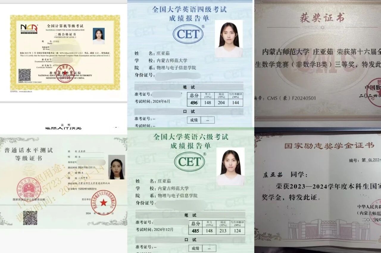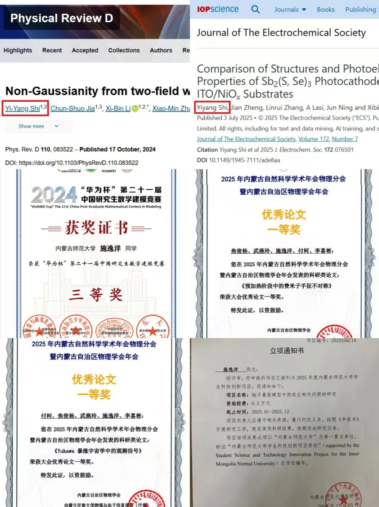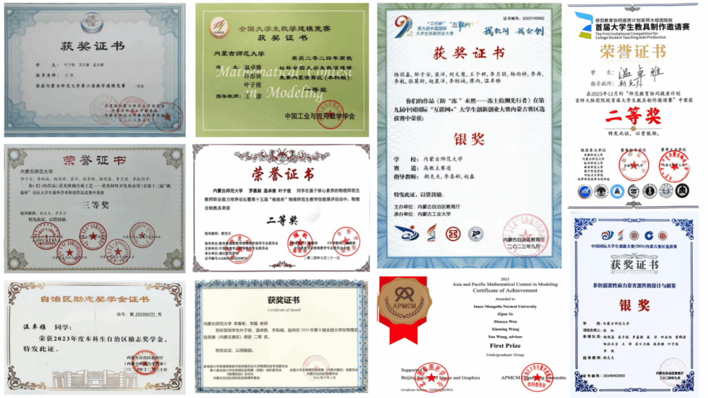 2022级物理学三班 中共预备党员 获得第九届互联网+高教主赛道省级银奖、亚太地区大学生数学建模竞赛国家级一等奖、第十五届“格致杯”物理自制教具二等奖、第十届全国大学生物理实验竞赛国家级三等奖