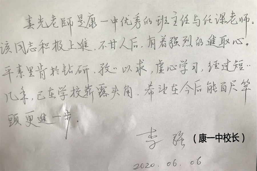 “春光老师是康一中优秀的班主任与任课老师,他积极上进,不甘人后,有着强烈的进取心;他肯于钻研,孜孜以求,虚心学习,经过短短几年,已在学校暂露头角,希望在今后百尺竿头更进一步......”康巴什区一中李强校长这样评价他。