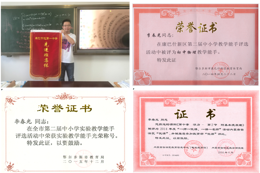 在中学物理教学中,他潜心钻研教材,精准把握学情,精心设计课堂活动,课上永远活力满满,并且巧妙地将学科知识与生活实际相融合;讲解深入浅出,深入学生心里,教学成绩优异。先后荣获“康巴什区物理教学能手”“鄂尔多斯市物理实验教学能手”,他的课例被评为自治区“一师一优课、一课一名师”活动“优课”,并被推荐参加教育部“优课”评比。在班主任工作中,所带的班级先后被评为“优秀班集体”“鄂尔多斯市温馨教室”,带出了三届毕业生,中考成绩突出,特别是2019年所带的54班(共42人)在中考升学考试中被鄂尔多斯市第一中学录取13人,是康一中建校以来,单个班级上市一中人数最多的班级。