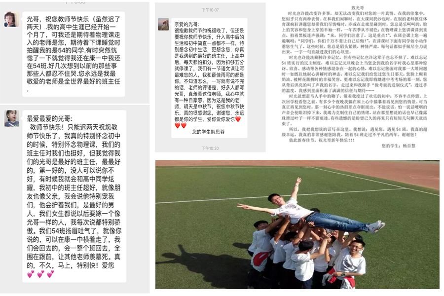 “我初中的班主任像朋友也像父亲,我会说他特别宠我们,他会护着我们,我们女生都说以后要嫁一个像光哥一样的人,每次说都特别骄傲......”“遇见您,遇见54班,我真的超级幸运,我真的非常感您......”学生是这样评价她的班主任“光哥”。
