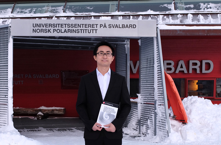 在硕士毕业后,怀揣着对极光的向往,勤奋好学的他于2012年底来到了世界最北的朗伊尔城小镇,在斯瓦尔巴德大学中心开始了他的博士生学习。这里紧邻我国北极黄河站约100公里。在这里学习和生活,不仅结识了他的博士导师和研究同事,更是让他在异国体验和收获到了许多特殊的感情和经历。在北极极端恶劣的自然条件下,不仅要照顾好自己的身心,更需要用心灵去体会人与自然的相互关系。在这里的野外,室外的体感温度冬天能达到零下40度;在伸手不见五指的极夜期间,即便北极熊通常在冬眠,但是在野外工作中,他和同事们仍然需要时刻保持警惕。他回忆说:“在这期间,我要感谢我所遇到的每一个人,是他们让我在世界的尽头有了非凡的体验。更要感谢我学习期间的导师,将我逐渐从一个科研‘小白’带到学术科研的道路上”。