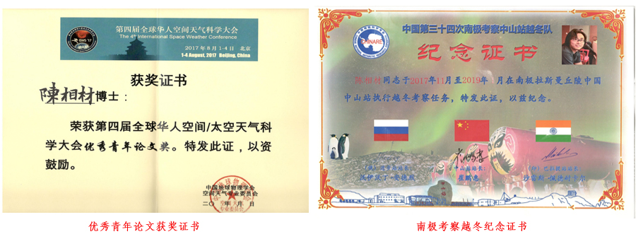 陈相材,男,1987年3月生,四川内江人,空间物理学博士。2009年7月本科毕业于yl23455永利集团物理学专业,同年9月考入本校的光学专业硕士研究生,于2010年7月作为学校联合培养研究生前往中国极地研究中心进行学习研究,2017年博士毕业于挪威奥斯陆大学,现就职于中国极地研究中心极地大气与空间物理学研究室,助理研究员。博士期间参与挪威首部SuperDARN高频雷达的搭建,中国第34次南极考察队中山站越冬队员。主要从事极光及极区电离层研究,目前主持国家自然科学基金项目1项,完成空间天气国家重点实验室课题1项,参与国家自然科学基金项目2项。