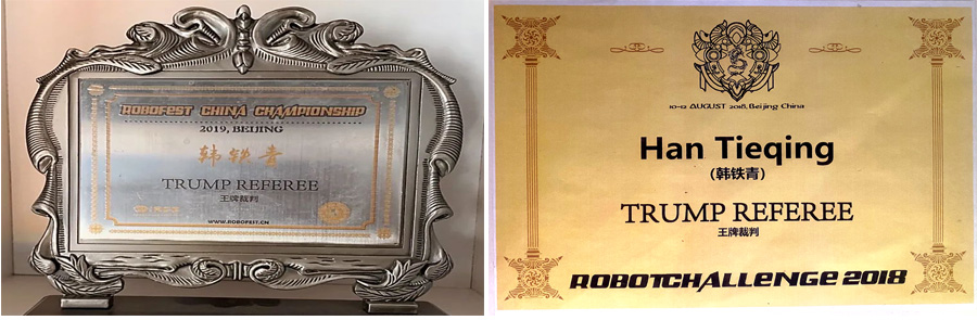 韩铁青还有一个身份就是机器人大赛裁判。2017年他带领的学生在Robofest世界机器人锦标赛(中国赛)获得全国亚军,同时在2017年Roborave国际机器人大赛(亚洲赛)获得亚洲赛亚军的优异成绩,这样他也成为了全国机器人比赛的焦点人物之一。在比赛官方的重重选拔下,韩老师在2018年2月份成功的当选全国机器人比赛裁判员,他秉承公正、公开、公平的原则对每一组比赛选手进行裁判,在2018年7月份在中国—北京举办的Robotchallenge国际机器人挑战赛(世界赛)被任命为王牌裁判。值得一提的是,2017年5月他带着6名选手代表中国队参加了在美国佛罗里达州奥兰多举办的Robofest世界机器人锦标赛(世界赛),经过13小时漫长的飞行他们来到了美国,经过15天的艰苦奋战比拼,他指导的孩子们在26个国家中脱颖而出获得了一等奖。