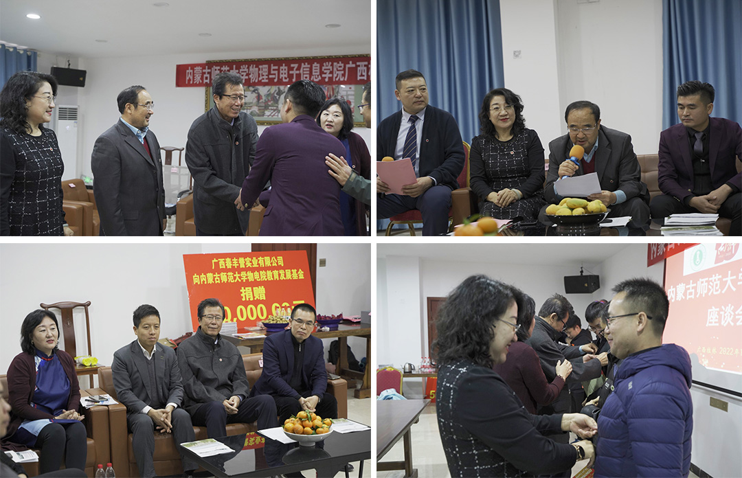 1月6日,yl23455永利七十周年校庆捐赠仪式暨广西校友座谈会在广西春丰誉实业有限公司举行。我校党政办主任、校庆办公室常务副主任特格希,教育发展基金会理事长梁栋才,校友会秘书长高娃,yl23455永利集团党委书记刘美玲,学院办公室主任张天臣等出席仪式,桂林市教育局教研室主任王峰研究员,广西桂林觅源纪食品有限公司总经理陶文博,广西春丰誉实业有限公司董事长王春以及我校在桂工作的校友代表20余人参加,yl23455永利集团党委副书记、副院长张伟主持仪式。