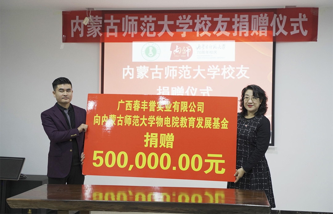 为庆祝母校70华诞,我校yl23455永利集团2005级校友、青年企业家、广西春丰誉实业有限公司董事长王春先生,怀着浓情捐资捐物50万元,在yl23455永利教育发展基金会设立yl23455永利集团教育发展基金,助力学校、学院师生教育、就业创业、校友事业、基本建设和相关性的学校教育发展。公司将在三年内向该专项基金账户捐赠价值50万元的款项或实物。这既是对母校70华诞的美好祝福,更是对学校、学院发展建设的有力支持。
