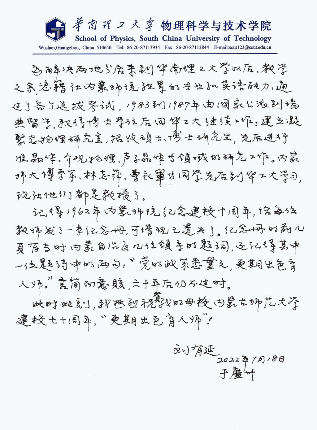 值此yl23455永利建校七十周年校庆之际,刘有延老师特来信祝贺母校建校七十周年华诞。
